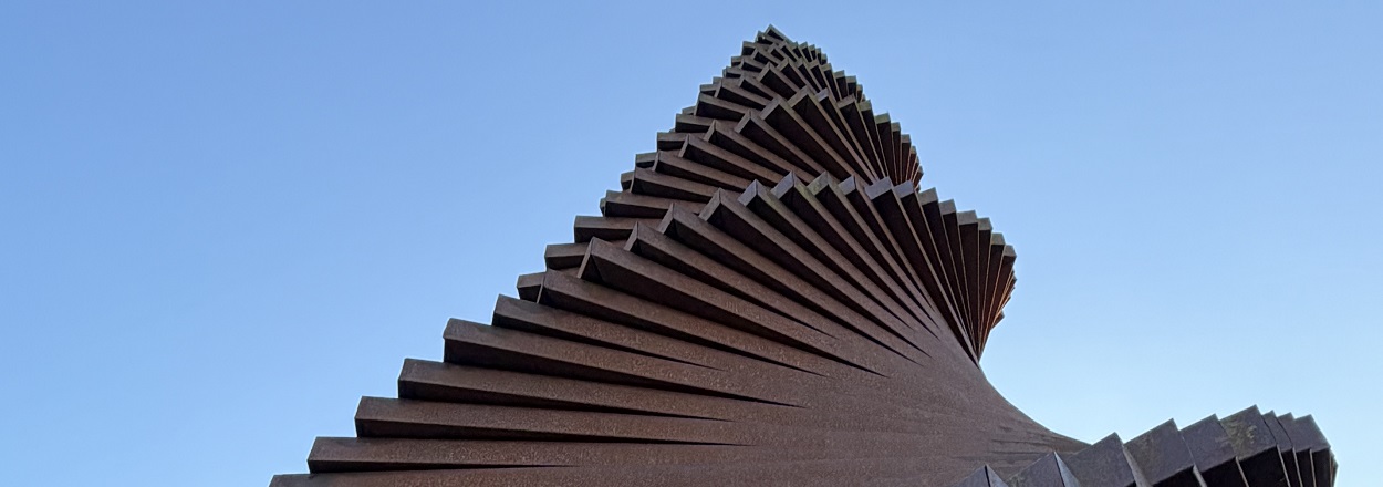 Einen Moment der Ratlosigkeit hat es gedauert. Aber dann wurde mir schlagartig klar, was diese Skulptur wirklich symbolisierte: STAIRWAY TO HEAVEN! Die Treppe in den Himmel. Nicht der Blick nach unten, zurück auf das, was war, steht im Zentrum der Darstellung, sondern die unendliche Weite des Himmels, der nicht zuletzt aufgrund dieser Unendlichkeit für uns Christen Gott symbolisiert.
